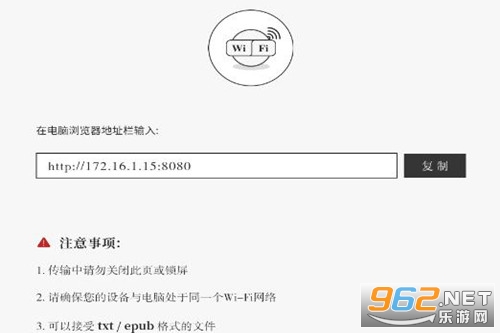 把电脑和手机接入同一个WiFi网络,接着在电脑浏览器的地址栏输入http://172.16.1.15:8080,就能完成书籍导入操作了。
