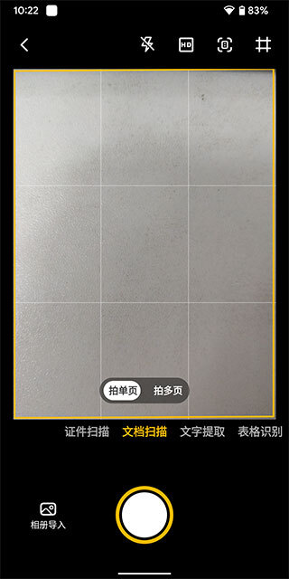 进入相机界面后,上方从左往右依次是“闪光灯开关”“图像像素尺寸”“图像自动裁剪”“网格显示开关”,下方则能切换识别功能。