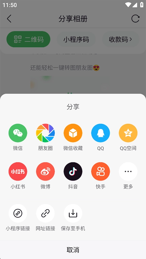 3、微购相册支持分享至微信、朋友圈、QQ、小红书、微博、抖音和快手等主流平台。