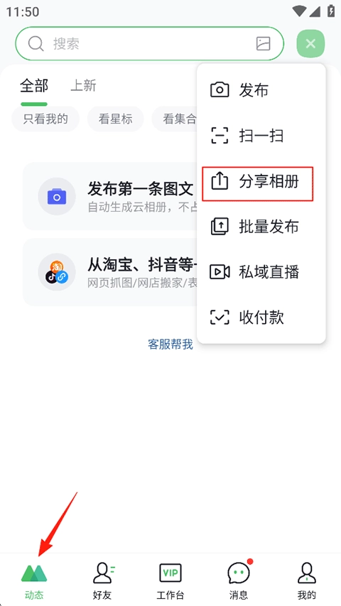 1、打开微购相册应用,进入动态页面后,点击右上角的加号图标,选择“分享相册”选项。