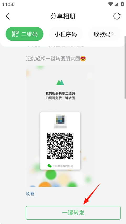 2、在分享相册页面,您可以将二维码展示给他人扫码来分享相册,也能点击下方的一键转发按钮完成分享。