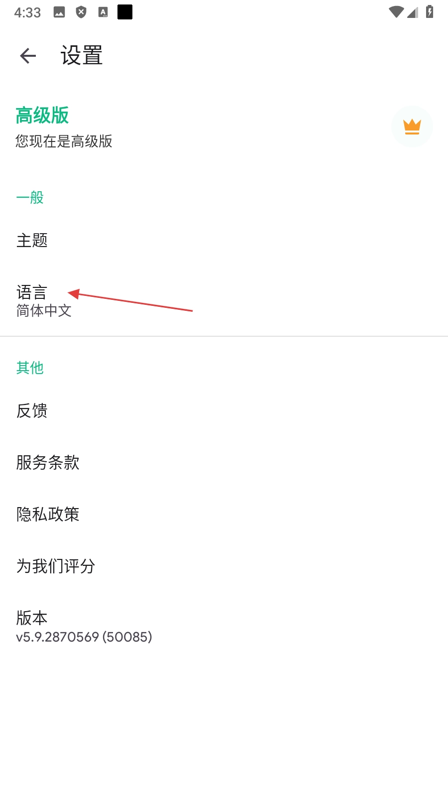 3、在设置页面,点击【语言】,进入语言选择页面。
