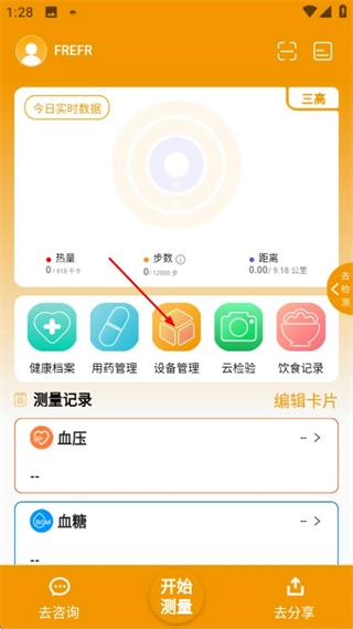 2、在健康数据页面点击设备管理选项,进入设备列表页面。
