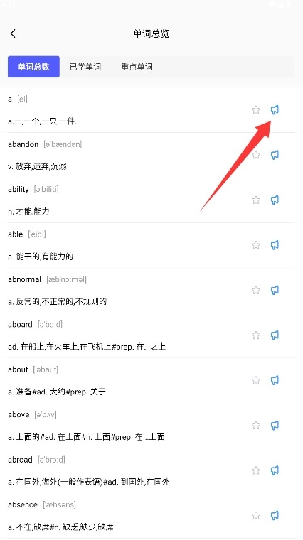2、选择需要练习的具体单词并点击语音播放按钮,跟随外教发音进行跟读学习练习。