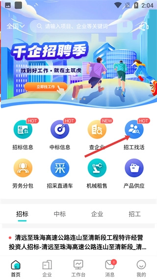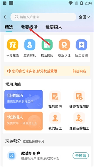 1、打开首页后,点击【招工找活】选项进入对应功能页面,在此页面能切换至求职或招聘的操作视角。