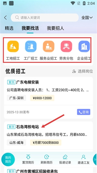 3、在“我要找活”的优质招工列表中,选定【石岛湾核电站】对应的招工信息,进入该岗位的详情页面。