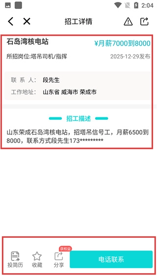 4、在招工详情页,查看岗位、薪资、工作地址等信息后,点击【电话联系】按钮,即可与招聘方沟通该岗位的求职相关事宜。