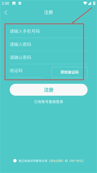 3、点击“没有账号?去注册”选项,进入账号注册页面。