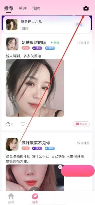 1.用户打开软件后,在动态页面点击右上角的相机图标,就能直接发布动态。