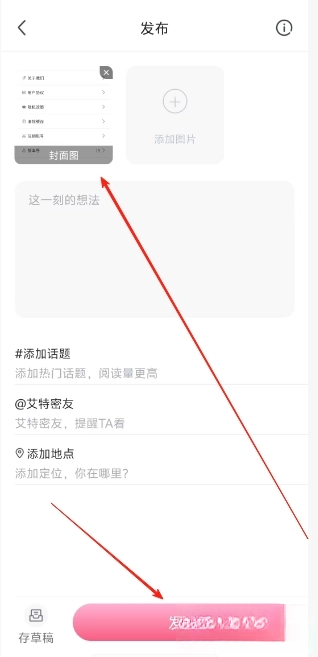 3.最后在发布页面填写好文案内容、话题、地点等信息,点击发布按钮就可以完成操作了。
