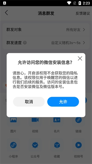 一键群发App是一款专为现代营销需求打造的智能工具,集人脉拓展、客户管理与高效营销于一体。全自动化一键操作,轻松实现跨平台智能群发,支持微信、短信等多渠道消息批量发送,并可根据好友昵称自动定制个性化内容,让节日祝福和营销推广更显用心。
