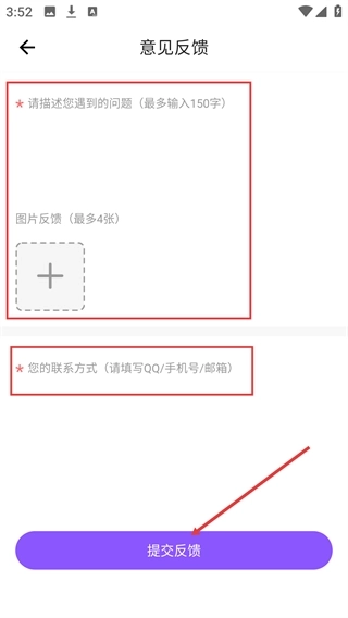 2、进入意见反馈页面后,请填写必填的“问题描述”和“联系方式”,您可以根据实际需求添加图片反馈(最多支持4张)。